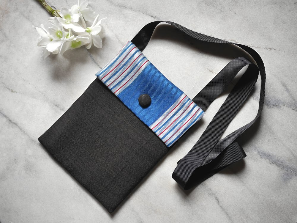 青の縞と墨色のポシェット(サコッシュ)【受注生産】