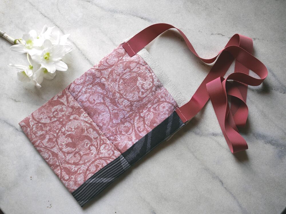 アイスグレーの縮緬とピンクの唐草のサコッシュ【受注制作】-着物地(古布)から
